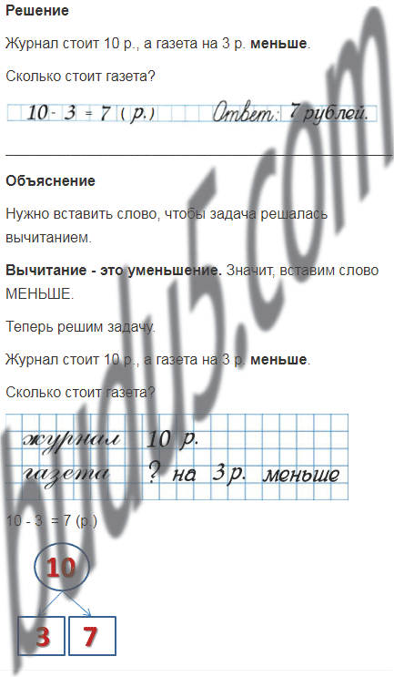 Журнал стоит 10 р., а газета на 3 р. ____________. Сколько стоит газета?