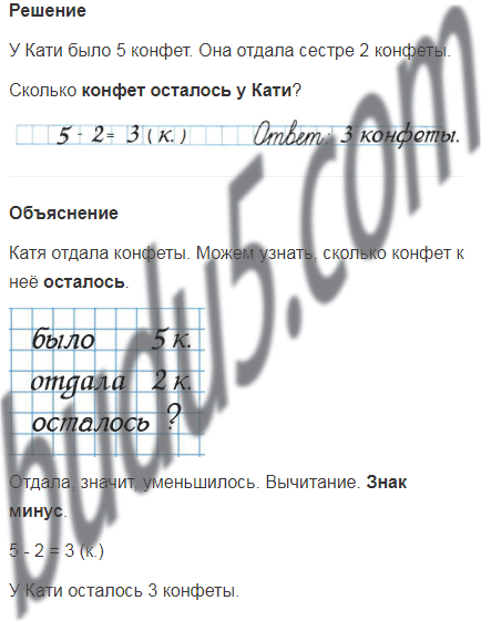 2. У Кати было 5 конфет. Она отдала сестре 2 конфеты.