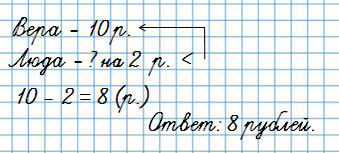Что известно из условия задачи? У Веры 10 р., а у Люды на 2 р. меньше.