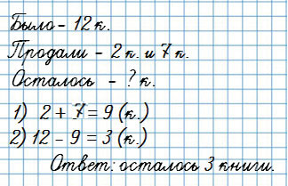 2. У продавца было 12 книг. Утром он про­дал 2 книги, а днём ещё 7 книг. Сколько книг осталось у продавца?