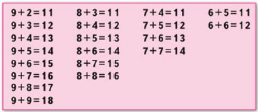 5 + 7 = 12 7 + 6 = 13 9 + 9 = 18 9 - 7 = 2
