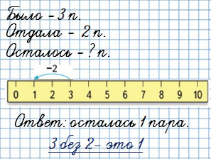 4. Бабушка связала 3 пары носков. Она дала внукам 2 пары носков. Сколько пар носков осталось у бабушки?