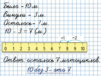 Из коробки, в которой было 10 мотоциклов, достали 3 мотоцикла. Сколько мотоциклов осталось в коробке?