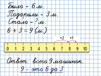 У Саши в коробке было 6 машинок. Ему подарили ещё 3 машинки. Сколько всего машинок стало у Саши?