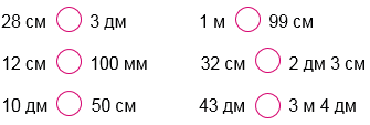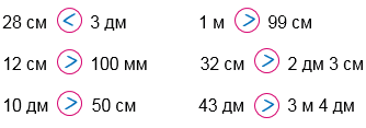 | 28 см < 3 дм 28 см < 30 cм | 1 м > 99 см 100 cм > 99 см |