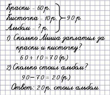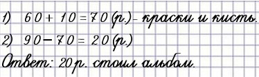 70 + 30 = 100 (р.) - не подходит, потому что в условии задачи сказано, что Миша заплатил 90 р., а получается, что только за кисточку и краски он заплатил 100 р.