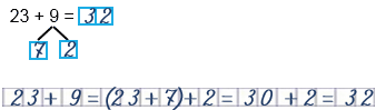 23 + 9 = 23 + (7 + 2) = (23 + 7) + 2 = 32