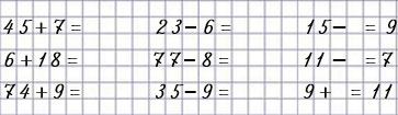 | 45 + 7 = 52 | 23 – 6 = 17 | 15 – 6 = 9 |