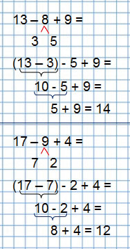 | 17 - 9 + 4 = 12 | 29 + 7 = 36 | 73 - 6 = 67 |