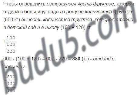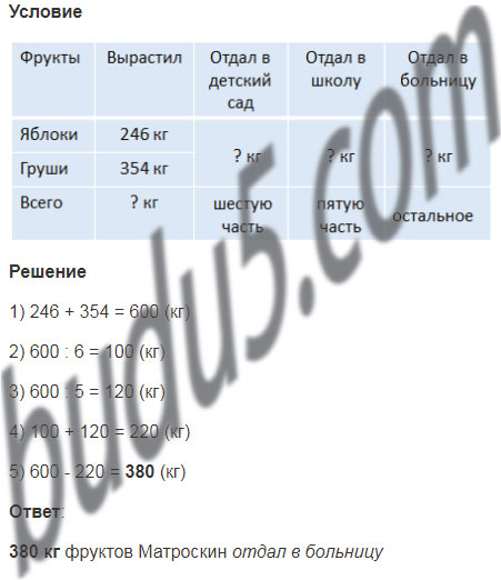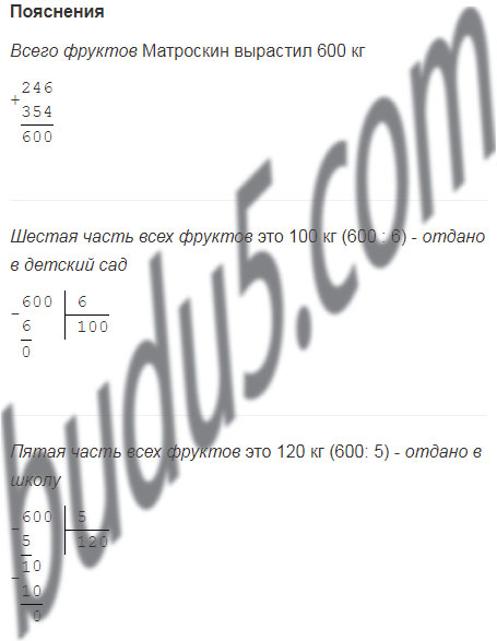 Кот Матроскин вырастил в своём саду 246 кг яблок и 354 кг груш. Шестую часть всех фруктов он отдал своим друзьям из детского сада, пятую часть всех фруктов — друзьям из школы, а остальное — в больницу. Сколько килограммов фруктов Матроскин отдал в больницу?