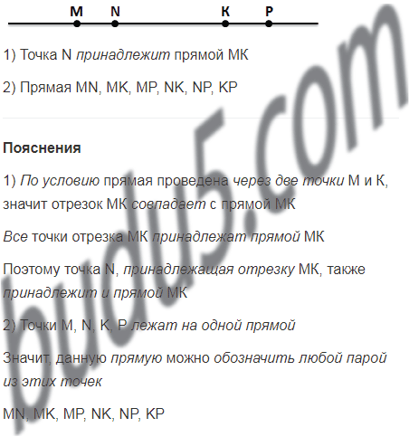 Отметьте в тетради точки М и К и проведите через них прямую. От­метьте на отрезке МК точку N. Принадлежит ли точка N пря­мой МК? Отметьте на прямой МК точку Р, лежащую вне отрез­ка МК. Запишите все возможные обозначения этой прямой.