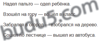 Надел - одел (пальто, ребёнка). Взошёл - вошёл (в класс, на гору). Забрался - взобрался (в огород, на дерево). Сошел - вышел (по лестнице, из автобуса).