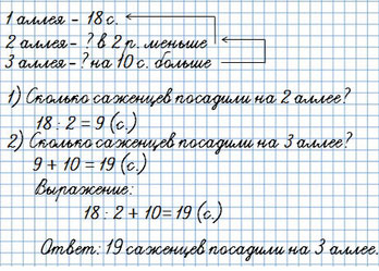 144. На первой аллее парка посадили 18 саженцев, на второй - в 2 раза меньше, чем на первой, а на третьей - на 10 саженцев больше, чем на второй. Сколько саженцев посадили на третьей аллее?