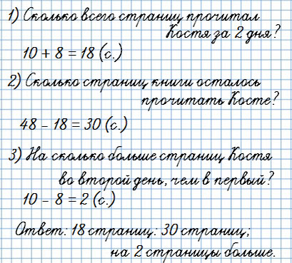 3) На сколько больше страниц Костя прочитал во второй день, чем в первый?