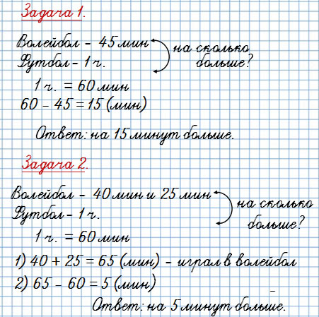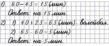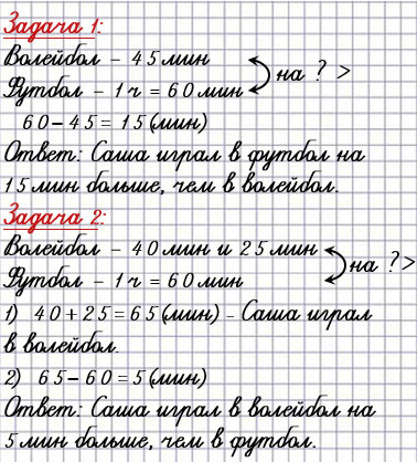 2) Саша играл в волейбол 40 мин утром и ещё 25 мин вечером. В футбол он играл 1 ч. На сколько минут больше Саша играл в футбол, чем в волейбол?