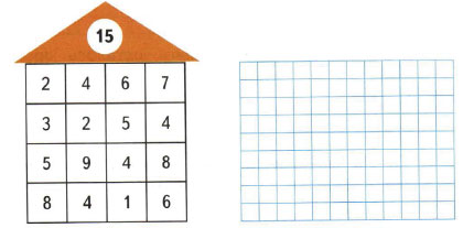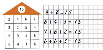 Из чисел, записанных в домике, набери число 15. Запиши четыре равенства.