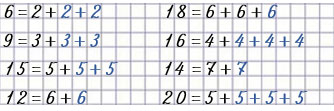 Закончи записи, заменяя каждое число суммой одинаковых слагаемых.