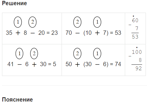 | 35 + 8 - 20 = 43 - 20 = 23 | 50 + (30 - 6) = 50 + 24 = 74 |