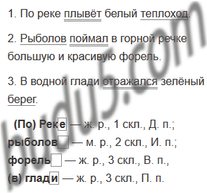 1. По, плывёт, белый, реке, теплоход. 2. Рыболов, в, поймал, большую, речке, и, горной, форель, красивую. 3. В, отражался, глади, водной, берег, зелёный.