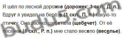 Я шёл по лесной дорошки. Вдрук я увидел на бе-рёзи какую-то птичьку. Она звонко щебитала. От её песенке мне стало весило.