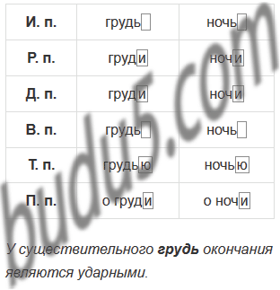 Просклоняйте имена существительные 3-го склонения грудь, ночь. Найдите их окончания и заполните таблицу до конца.