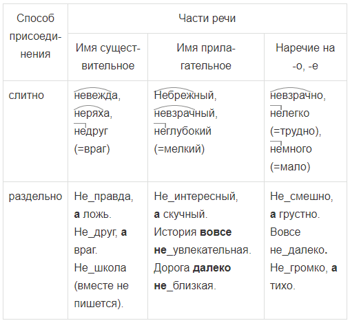 Отберите и систематизируйте материал. Составьте таблицу «Не с существительными, прилагательными, наречиями на -о и -е». По вертикали должна располагаться графа «Способ присоединения не (слитно или раздельно)», а по горизонтали - «Части речи». Заполните таблицу тремя примерами, обозначая в них условия выбора слитного или раздельного написания не.