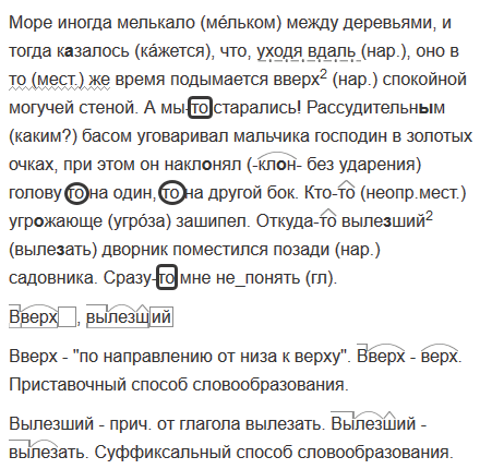 1. Море иногда м..лькало между деревьями, и тогда к..залось, что уходя (в)даль оно в то(же) время подымается (в)верх2 спокойной могучей стеной. 2. А мы(то) старались! 3. Рассудительн..м басом уговаривал мальчика господин в золотых очках при этом он наклонял голову то на один то па другой бок. 4. Кто(то) угр..жающе зашипел. 5. Откуда(то) выле(з, с)ший2 дворник поместился (по)зади садовника. 6. Сразу(то) мне (не)понять.