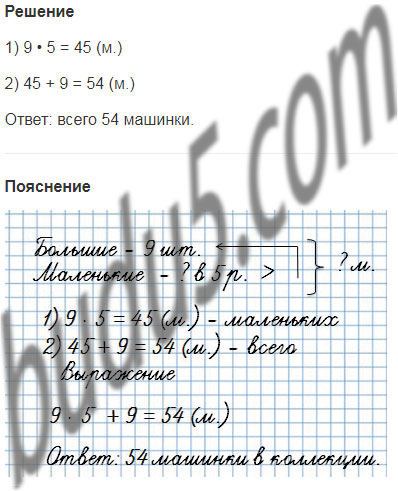 3. В коллекции было 9 больших машинок, а маленьких — в 5 раз больше. Сколько всего машинок было в коллекции?