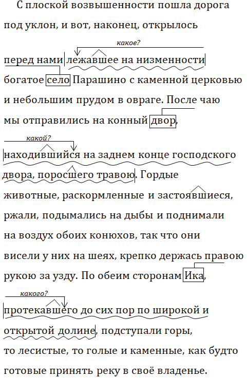 1. С плоской возвыше(н, нн)ости пошла дорога под уклон, и вот, наконец, открылось (перед)нами (лежать) на низме(н, нн)ости богатое село Парашино с каме(н, нн)ой церковью и (не)большим прудом в овраге. 2. После чаю мы отправились на ко(н, нн)ый двор, (находиться) на задн..м конце г..сподского двора, (порасти) травою. 3. Гордые животные, ра..кормле(н, нн)ые и (застояться), ржали, подымались на дыбы и подн..мали на воздух обоих конюхов, так что они в..сели у них на шеях, крепко д..ржась правою рукою за узду. 4. По обеим сторонам Ика, (протекать) до сих пор по ш..рокой и открытой долин.., подступали горы, то лесистые, то голые и каменные, как буд(то) готовые пр..нять реку в своё вл..денье.