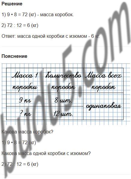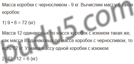 54. Масса 12 одинаковых по массе коробок с изюмом такая же, как масса 8 одинаковых по массе коробок с черносливом. Найди массу одной коробки с изюмом, если масса коробки с черносливом 9 кг.