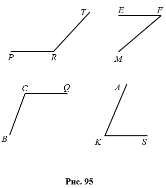 Найдите, пользуясь транспортиром, градусные меры углов, изображенных на рисунке 95. Определите вид каждого угла.
