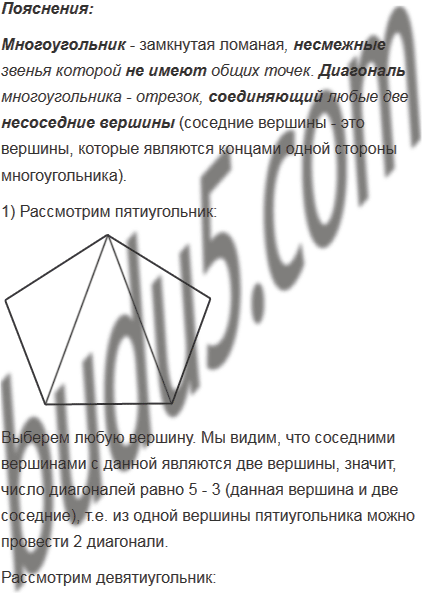 1) Сколько диагоналей можно провести из одной вершины: а) пятиугольника; б) девятиугольника; в) n - угольника, где n > 3?