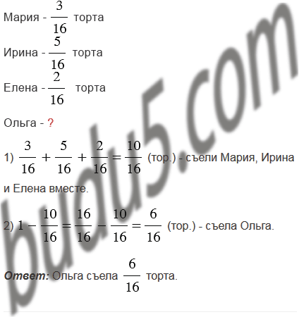 Мария, Ирина, Елена и Ольга съели торт. Мария съела торта, Ирина - , Елена - . Какую часть торта съела Ольга?