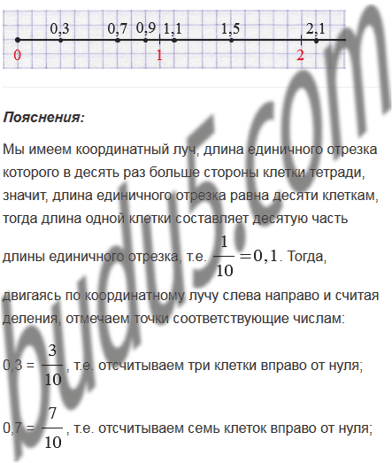 Начертите координатный луч, взяв за единичный такой отрезок, длина которого в десять раз больше стороны клетки тетради. Отметьте на луче точки, соответствующие числам 0,3; 0,7; 0,9; 1,1; 1,5; 2,1.