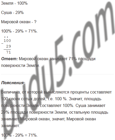 Суша занимает 29% площади поверхности Земли, а остальную поверхность занимает Мировой океан. Сколько процентов площади поверхности Земли занимает Мировой океан?