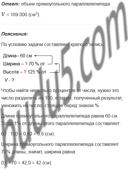 Длина прямоугольного параллелепипеда равна 60 см, его ширина составляет 70% длины, а высота - 125% длины. Вычислите объем прямоугольного параллелепипеда.