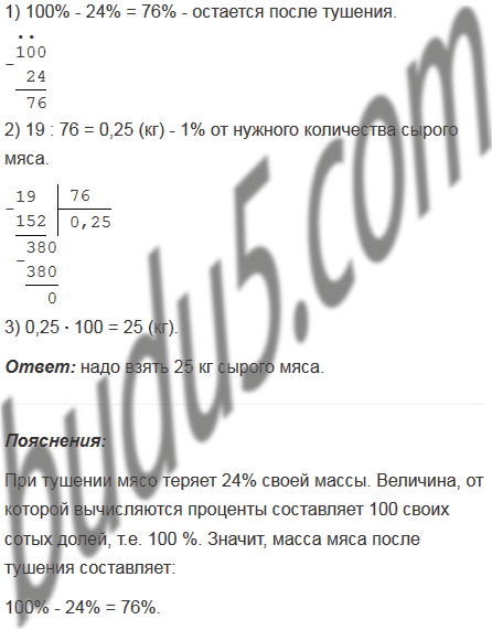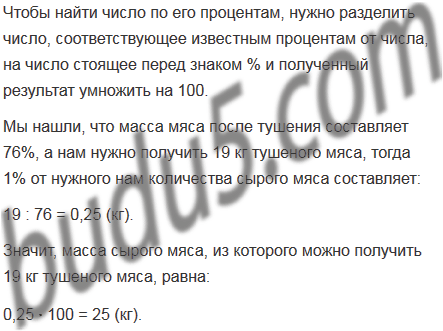 При тушении мясо теряет 24% своей массы. Сколько килограммов сырого мяса надо взять, чтобы получить 19 кг тушеного?
