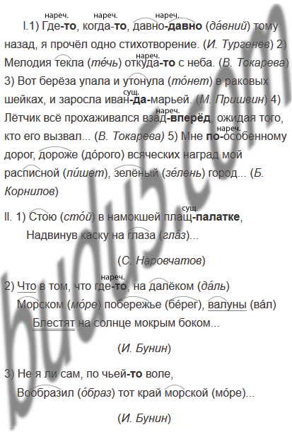 l.1) Где(то), когда(то), давно(давно) тому назад, я прочёл одно стихотворение. (И. Тургенев) 2) Мелодия текла откуда(то) с неба. (В. Токарева) 3) Вот берёза упала и утонула в раковых шейках и заросла иван(да)марьей. (М. Пришвин) 4) Лётчик всё прохаживался взад(вперёд), ожидая того, кто его вызвал... (В. Токарева) 5) Мне (по)особенному дорог, дороже всяческих наград мой расписной, зелёный город... (Б. Корнилов)