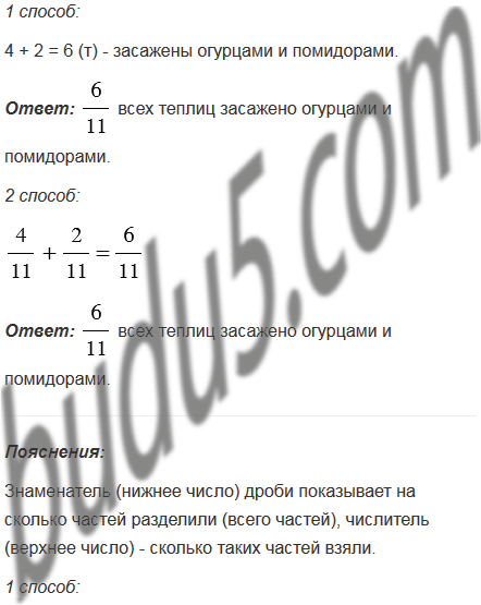 Из 11 теплиц овощеводческого хозяйства 4 засажены помидорами, а 2 - огурцами. Какая часть теплиц занята огурцами и помидорами? Решите задачу двумя способами.