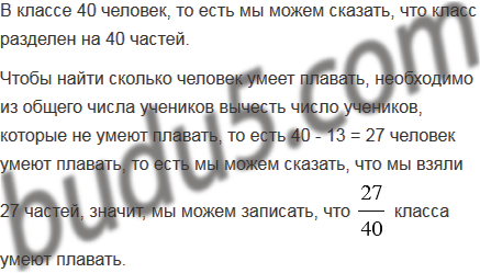 В классе 40 человек. Из них 13 человек ещё не научились плавать. Какая часть учащихся класса умеет плавать?