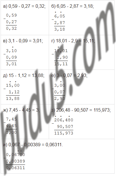 а) 0,59 - 0,27; г) 18,01 - 2,9; ж) 7,45 - 4,45;