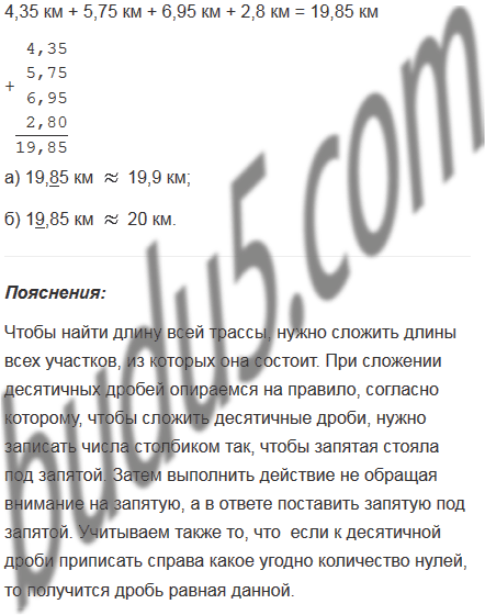 Трасса лыжных гонок состоит из 4 участков. Первый участок имеет длину 4,35 км, второй - 5,75 км, третий - 6,95 км и четвертый - 2,8 км. Найдите длину всей трассы и округлите ответ: