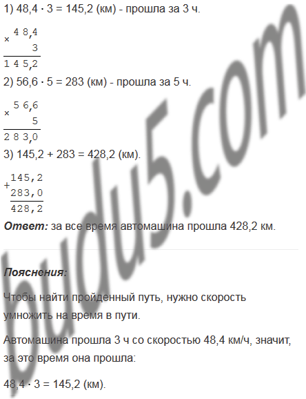 Автомашина прошла 3 ч со скоростью 48,4 км/ч и 5 ч со скоростью 56,6 км/ч. Какой путь прошла автомашина за все это время?