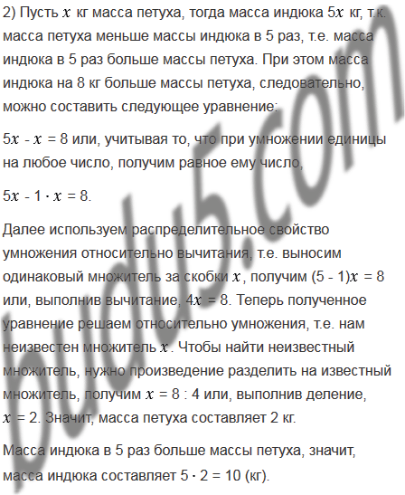 2) Масса петуха меньше массы индюка в 5 раз, а масса индюка на 8 кг больше массы петуха. Какова масса каждой птицы?