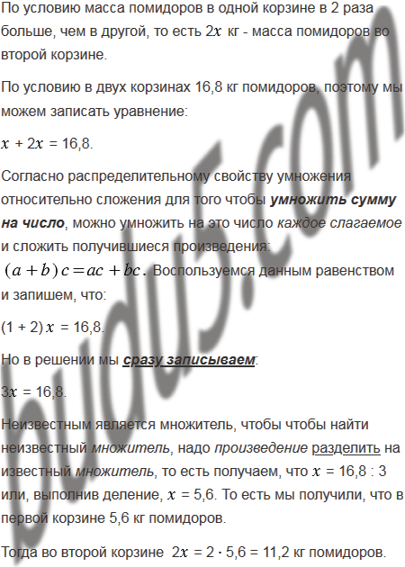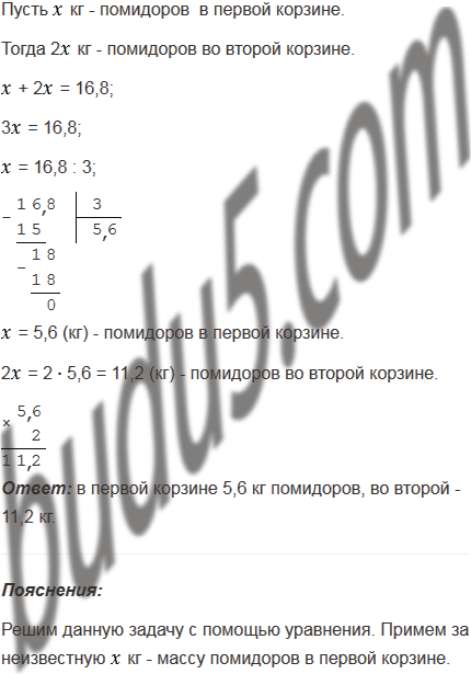 В двух корзинах 16,8 кг помидоров. Масса помидоров в одной корзине в 2 раза больше, чем в другой. Сколько килограммов помидоров в каждой корзине?