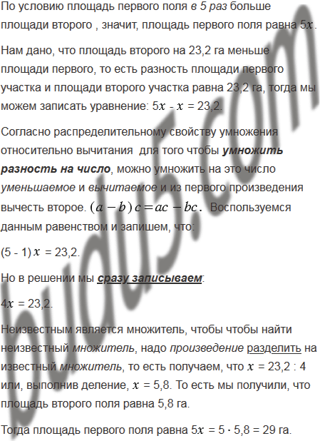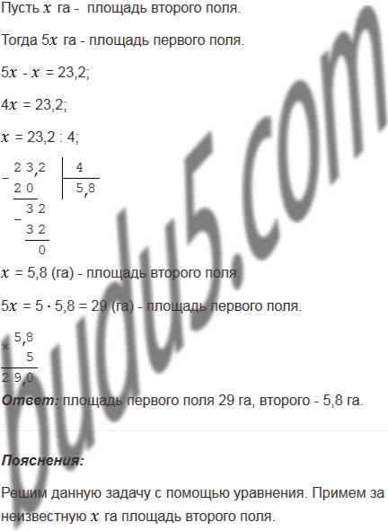 Площадь первого поля в 5 раз больше площади второго. Чему равна площадь каждого поля, если площадь второго на 23,2 га меньше площади первого?