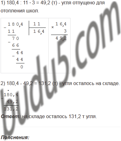 На складе было 180,4 т угля. Для отопления школ отпущено этого угля. Сколько тонн угля осталось на складе?