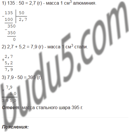 Алюминиевый шар, объем которого 50 см3, имеет массу 135 г. Чему равна масса стального шара того же объема, если масса 1 см3 алюминия на 5,2 г меньше массы 1 см3 стали?