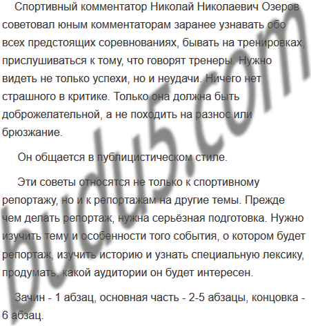 Д+ Как вы думаете, советы Н. Н. Озерова относятся только к спортивному репортажу или к репортажу на любую тему? Обоснуйте ваш ответ. Расскажите, как построен текст. Найдите в нём зачин, центральную часть, концовку.