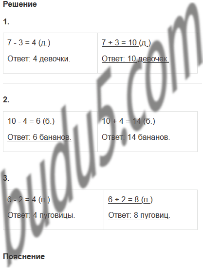 | 10 - 4 = 6 (б.) Ответ: 6 бананов. | 10 + 4 = 14 (б.) Ответ: 14 бананов. |